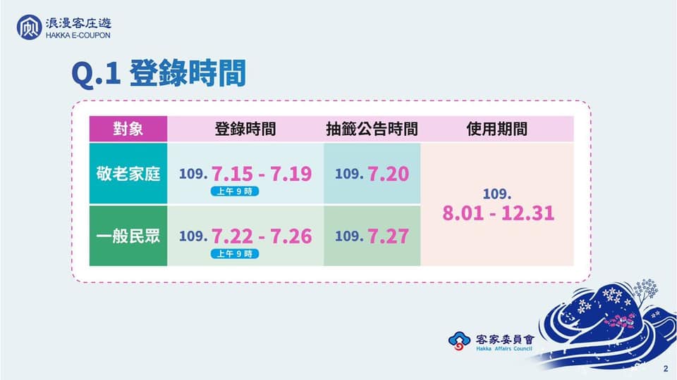 ❶敬老家庭:7/15 早上9:00-7/19 24:00 開放登錄抽籤(以家庭為單位抽籤)
