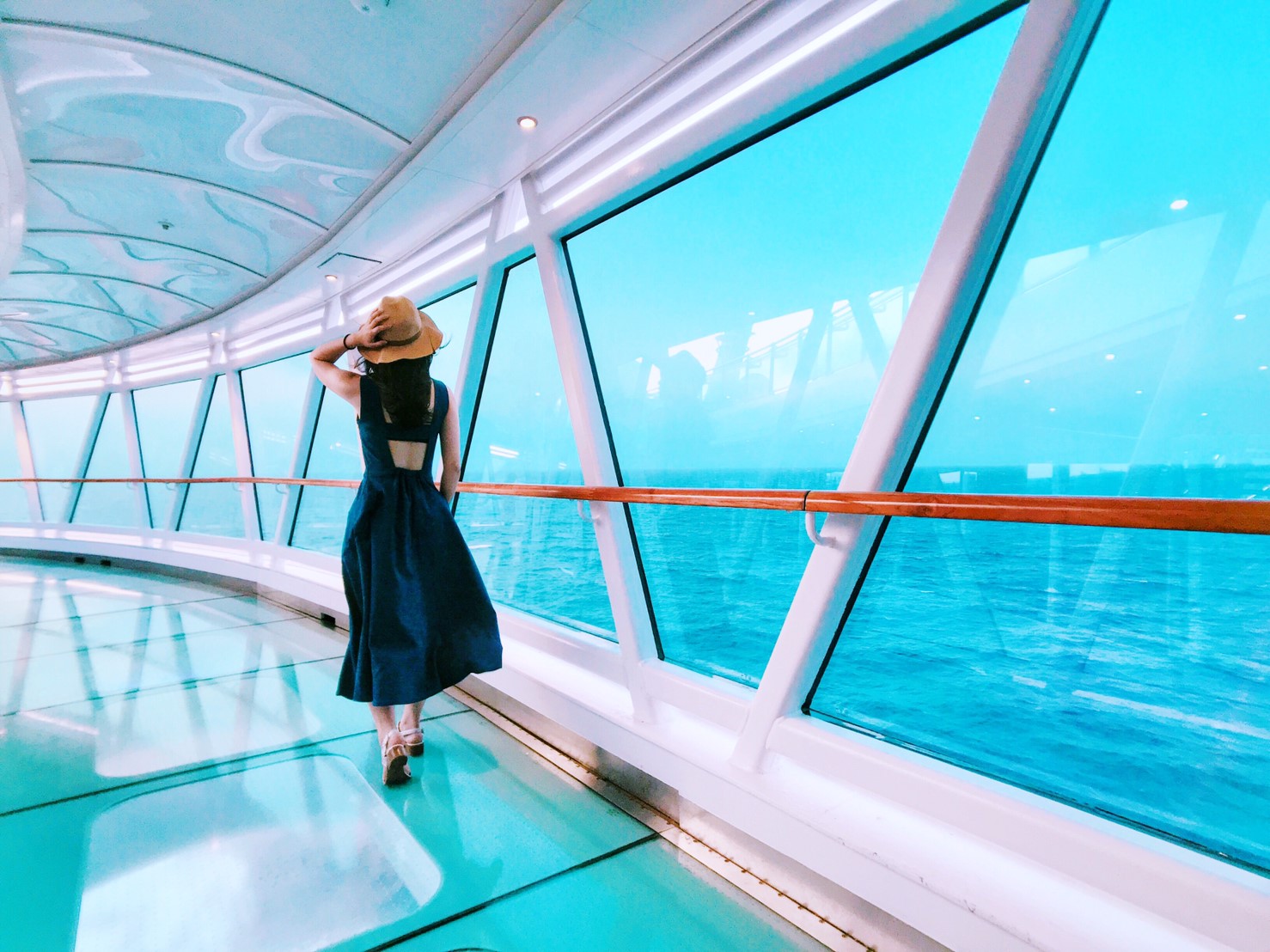 盛世公主最代表性的打卡夯點,絕對是獨創的「海上天空步道」!「海上天空步道」被譽為是海上十大新奇特色設施,凌空於海面39公尺高,並以全透明玻璃幕牆打造,360度無敵海景全部盡收眼底。當你走在圓弧流線的透明步道上,藍色大海就在腳底下,好像在走一個藍色星光大道的感覺,不僅氣場十足,夢幻指數也滿分破表。