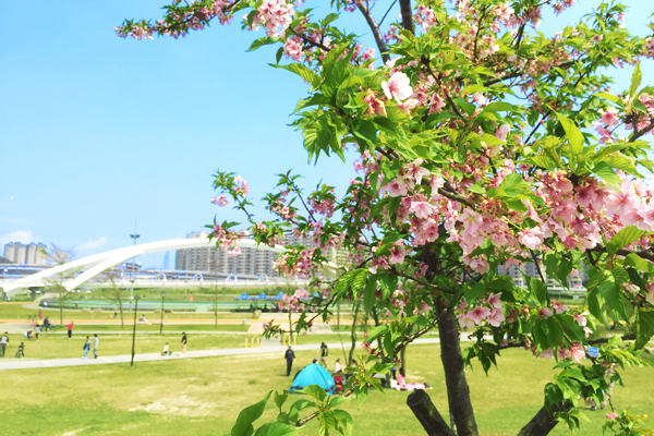 新店陽光運動公園的河津櫻,是來自日本伊豆半導河津町的河津櫻花,河津櫻是日本大島櫻與台灣緋寒櫻自然混交的品種,單瓣花瓣、花型碩大且呈粉紅色,種植於鄰近都會區的河濱公園溪畔,與綠葉藍天相襯,洋溢幸福氣息。